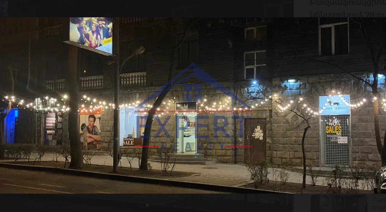 Վարձով է տրվում կոմերցիոն տարածք՝ Մաշտոցի պողոտա, տարածքը կիսանկուղային է, բաղկացած է 2 սրահից և փոքրիկ խոհանոցից, տարածքի ընդհանուր մակերեսը 135քմ է։ Առկա է կոմունալ բոլոր հարմարությունները՝ տաքացվող հատակ, գազ, ջուր, լույս, եռաֆազ հոսանք, սանհանգույց, բարձր որակի եվրոպատուհաններ, բոլոր սենյակները ...